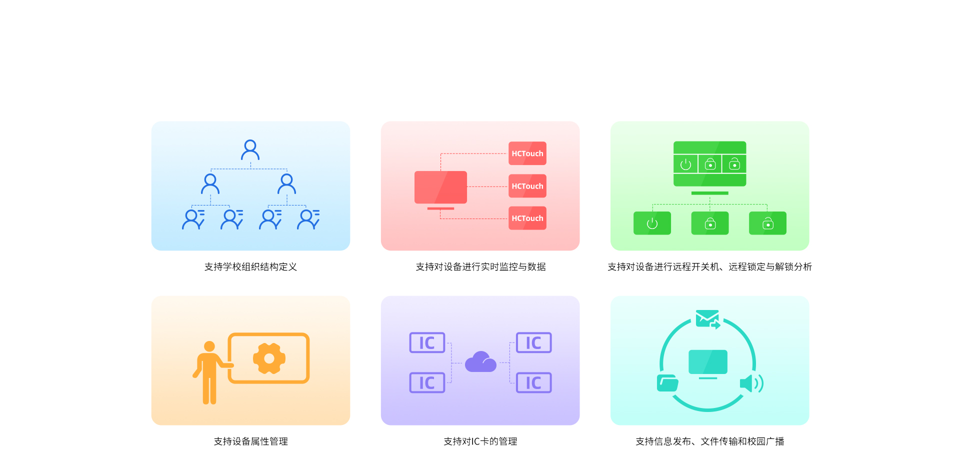 进行自由分组、定时开关机、远程发布信息、远程文件传送、音视频点播、校园广播等集中管控;